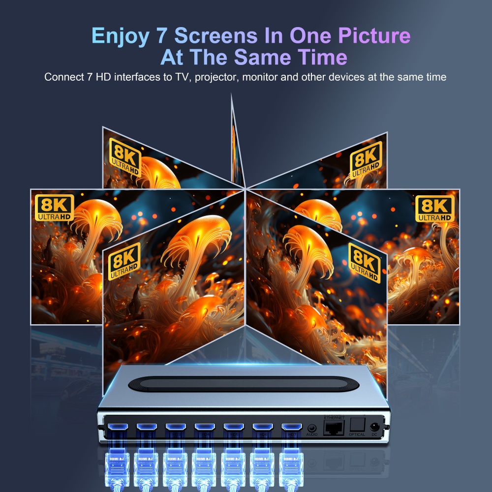 - 7-Screen Output: 7x HDMI 2.1a ports, each one supports max 8K@60Hz output. This allows you to simultaneously drive seven identical displays from a single device, creating impactful synchronized advertising arrays with ease.